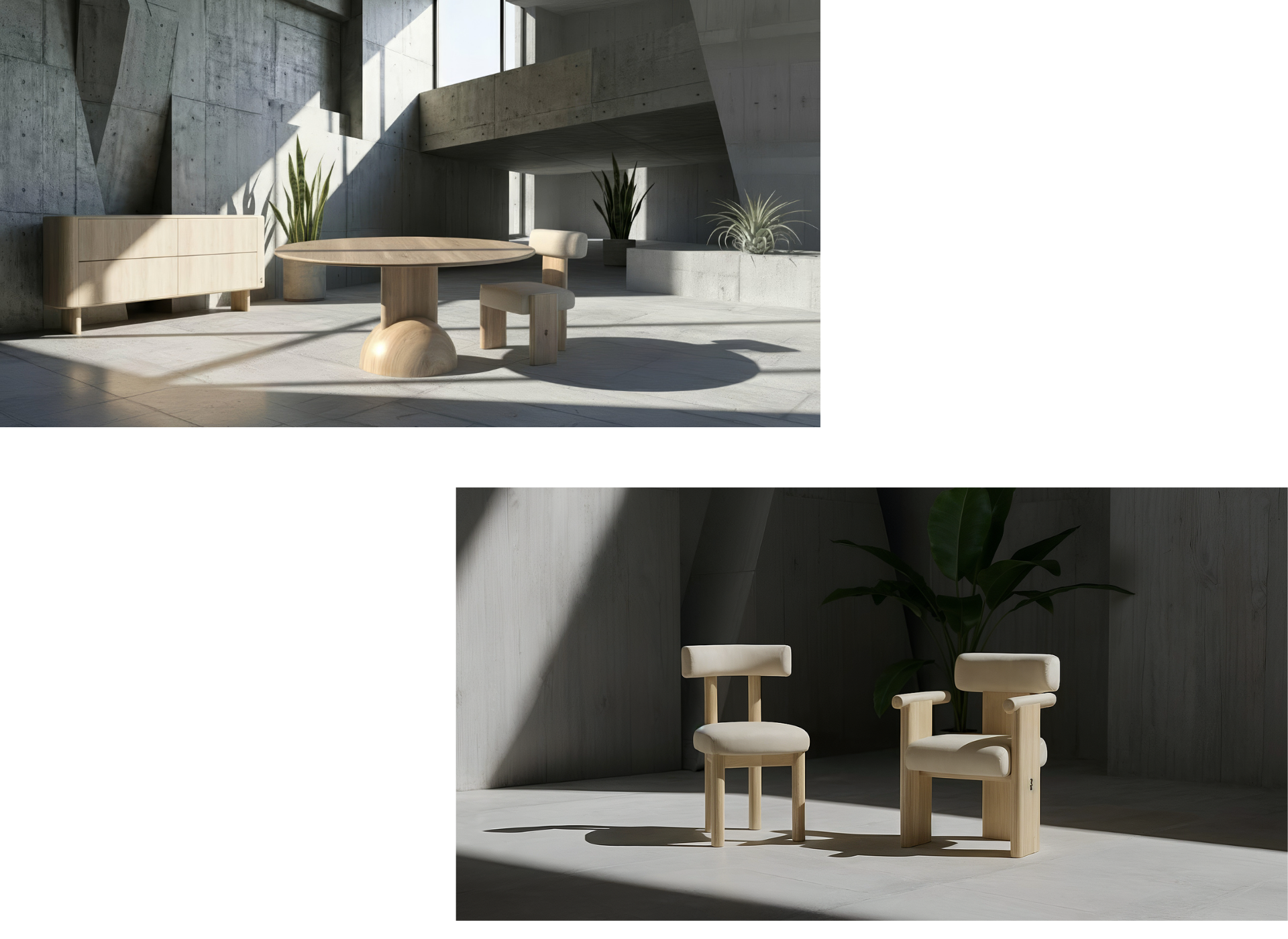 Muebles que respiran:suaves en el gesto, sólidos en presencia. Cada elemento —sofás, mesas, cómodas o escritorios— parte de un lenguaje común de curvas envolventes, proporciones generosas y materiales honestos.